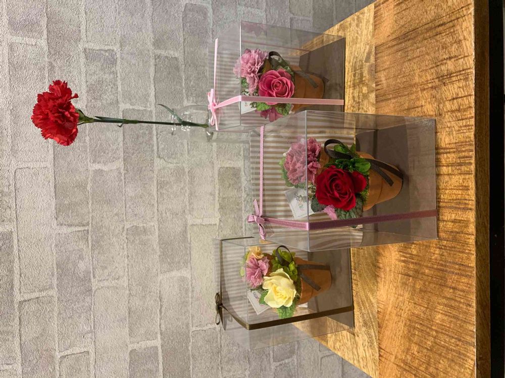 バラとカーネーションをあしらった、母の日にピッタリのプリザーブドフラワーのご紹介です。お忙しいお母様や、お花のお世話がちょっぴり苦手なお母様には手間の掛からないプリザーブドフラワーがおすすめ!