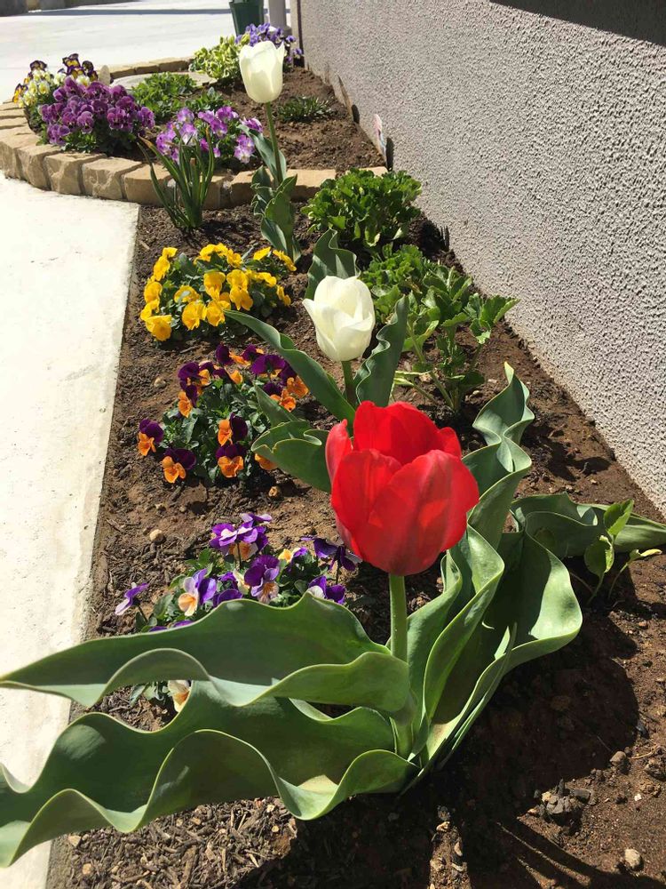 一番に芽が出てきて、一番葉が大きいチューリップがやっと咲いた🌷
