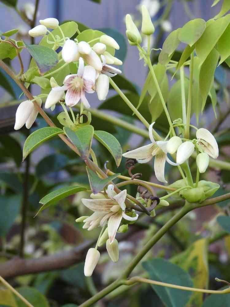 道すがら❗民家の塀越しに覗いていたムベ(アケビ科)の花🌼💓