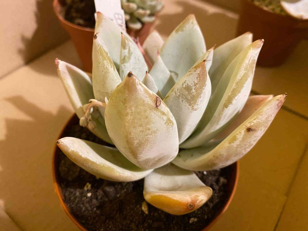 植え替えたばかりでグラグラしてるのと配送の時にキッチンペーパーでグルグルになってたので粉取れてるのを差し引いても…なんかあんまし綺麗じゃない🙁花芽も垂れてるし…調子崩してなかったらいいけど…