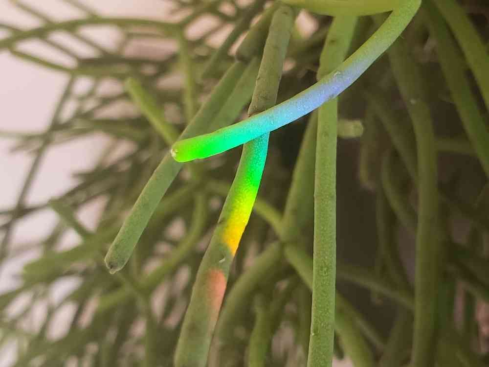 おはようの挨拶してたら、リプサリスの葉に虹の光があたってて✨