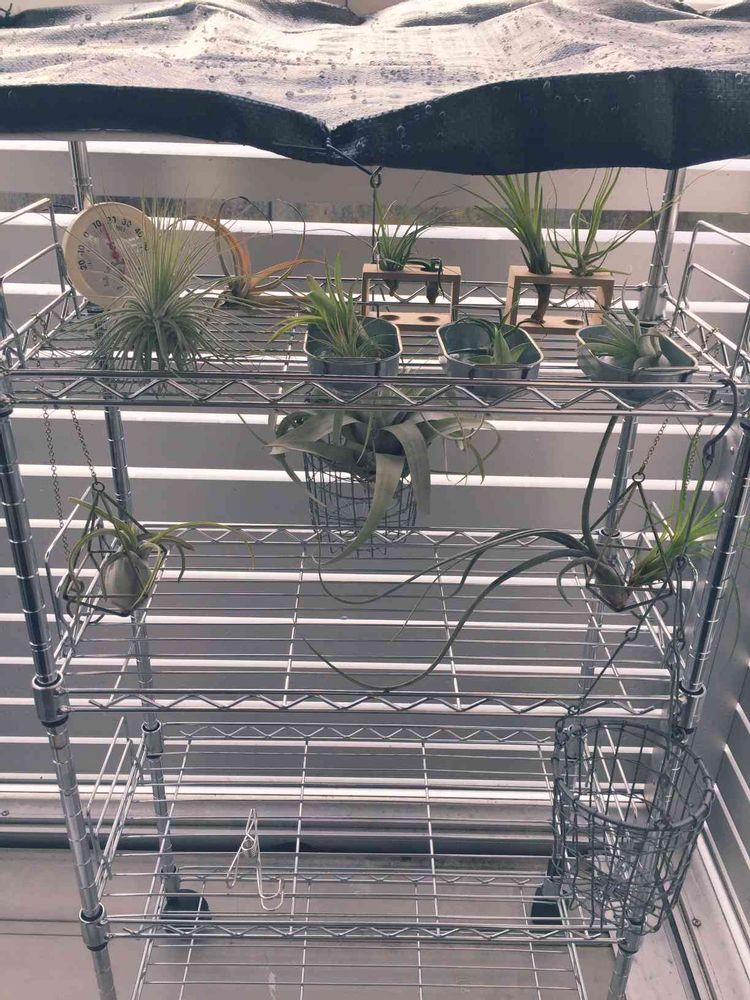 DIYとエアプランツが流行ってる時代でよかったなあ、とDAISOに通い詰めながらいつも思います。寒冷紗売ってるとは思わなんだ。屋根はDAISOの金網?に寒冷紗つけてベランダに括り付けてます。折りたたみ式。