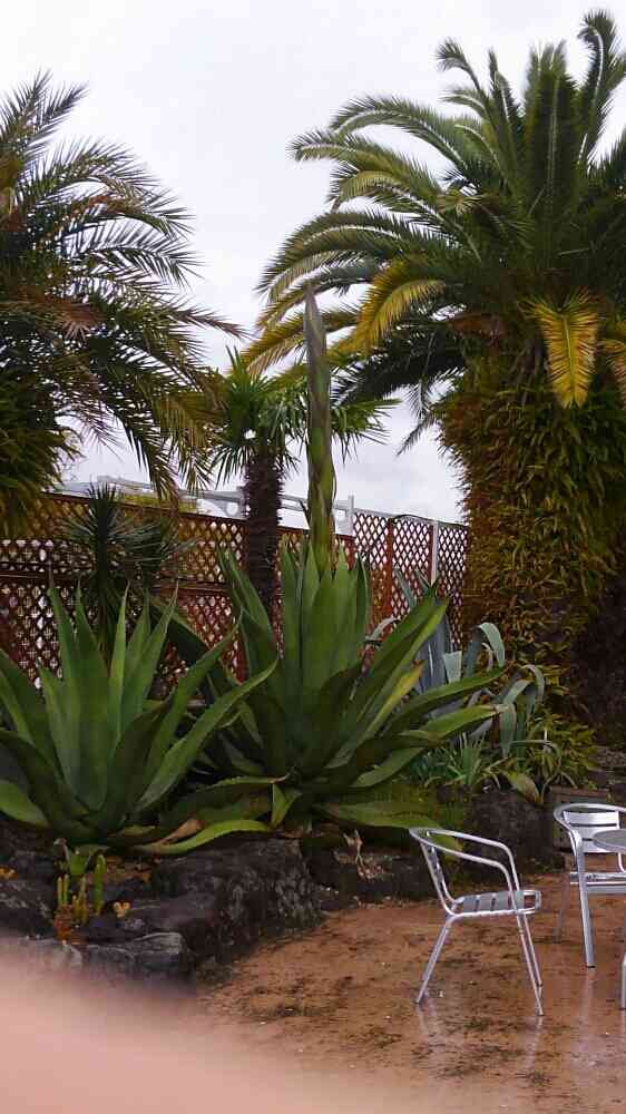 このアガベと椰子の木が迫力満点。アガベは花芽も入れると3メートルくらい。