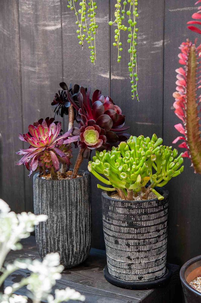 左側のアエオニウムの寄せ植えも、植え替え✨新入りのマルディグラを一緒に混ぜ込んでみました。今回は色々な向きで正面に出来る様に全部を外向きにして植えてみましたが、一方を正面に決めて植えるのもありなので、ちょっと悩みました。しばらく様子を見て、再植え替えもありか。。🤨