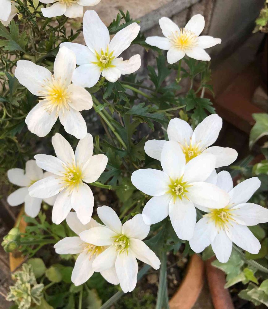 あそこのお宅の玄関先も可愛い寄せ植えがあるんだよなーと、通ってみると、やっぱり咲いていました。クレマチスカートマニージョ。
