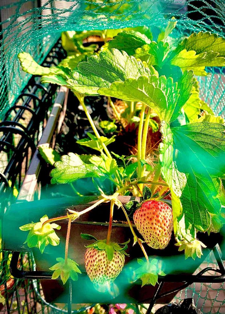 昨秋ランナーから分けた11株。フェンスでプランター栽培。まだ完熟前ですが、夕陽を浴びて赤みが増したよう。急いで防鳥ネットを巻きました。今から収穫が楽しみです。