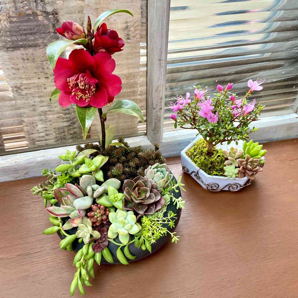 多肉コラボ盆栽💖黒椿ナイトライダー編💖そして前回の雲仙こめつつじもお花咲きましたよ🥰