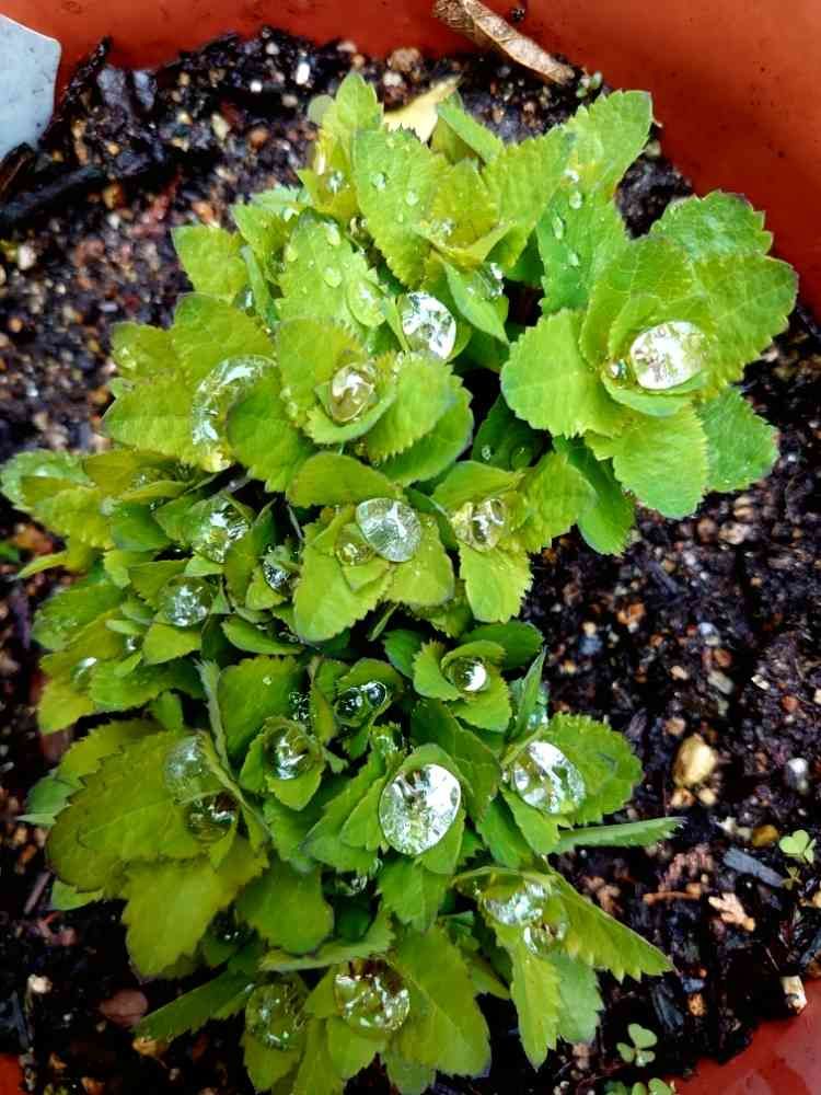 鉢植えですが、3年目の桔梗が芽を出して、水滴が宝石💎のようです。✨✨✨