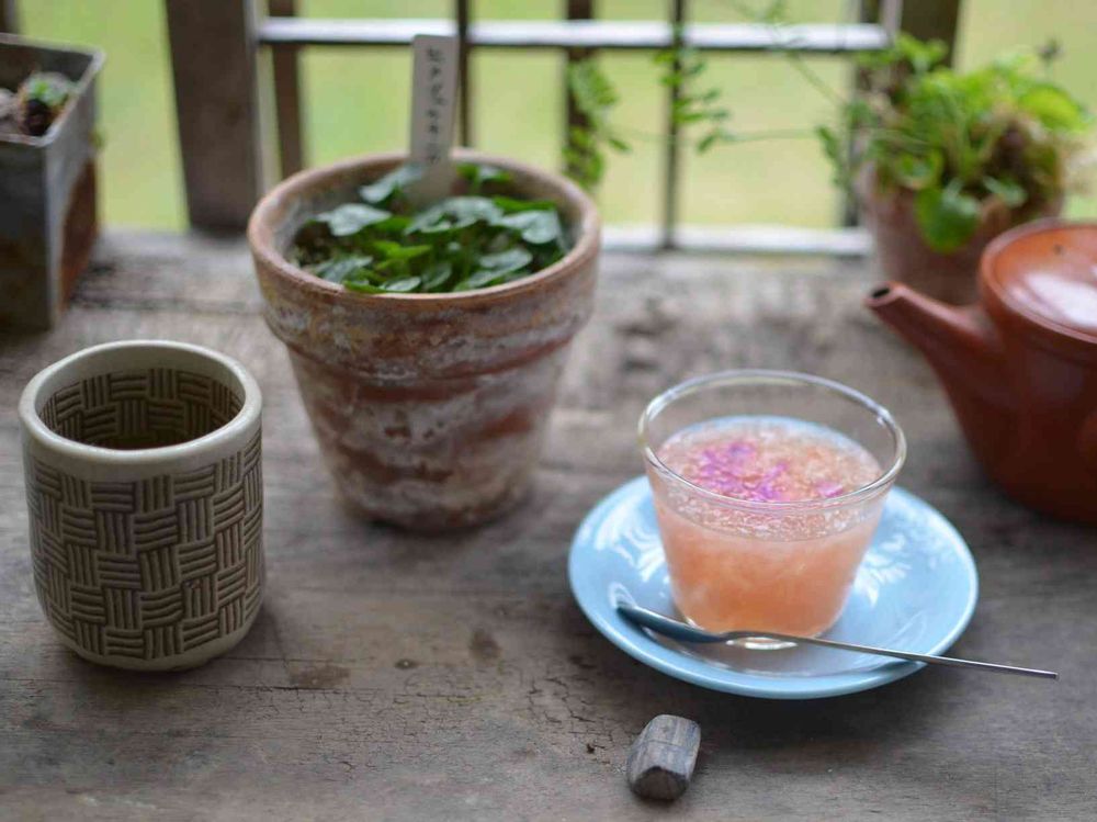 グレープフルーツ ルビーをベースにしたゼリーにホトケノザ、オオアラセイトウ、オオイヌノフグリの花びらを浮かべてみました。