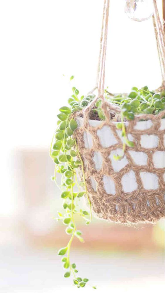 わが家の軒下につるされたグリーンネックレス。春になったので、ハンギングも新しく編みました(^^)