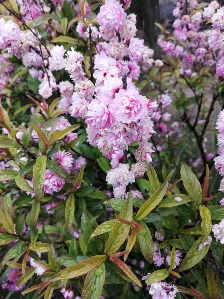 お庭に植わってた低木についているお花で、形はシロツメクサに似ていてピンク色です。
