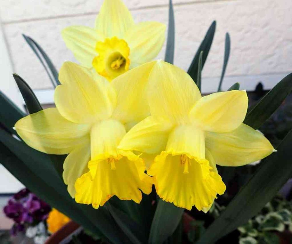 ラッパ水仙、ピスタチオです。同じ鉢で3年も咲いてくれた有難いお花です😊写真だとわかりにくいですが、花筒の下半分から花弁の中央にかけて白っぽく色が抜けてくるのが特徴で、咲き始めは黄色一色に見えます。こういうのを逆色ラッパなんて呼ぶこともあるそうです。逆、というのは、水仙は、全部黄色や全部白の他に、花弁が白で筒が黄色というのもありますが、逆に、花弁が黄色で筒が白という色は昔はなかったのです。今は結構そういう品種も増えてきているので別に珍しい感じはしないかもしれませんねー。んんじゅうねんまえに、「スペルバインダー」という品種を初めて見たときの衝撃は、今から思うとあほみたいですが、ほんとにがびーん!👀というものでした。花弁も細目で縒れていて、昔風の花型で、今はもう販売されているのを見なくなりましたが、もし見つけたらまた買ってしまうでしょう😅それほど逆色って、画期的な品種だったんですねー(*^▽^*)今ではずっと整ったきれいな花型で、色もくっきりはっきりした逆色の新しい品種が多数出ていますが、郷愁というか、思い出なんですねー、名前もちょっと素敵ですよね😊脱線しましたが、このピスタチオも、なかなかきれいなレモンイエローで、お気に入りの品種です。長持ちしてくれたのでさらに好きになりましたヾ(≧∇≦)ノ