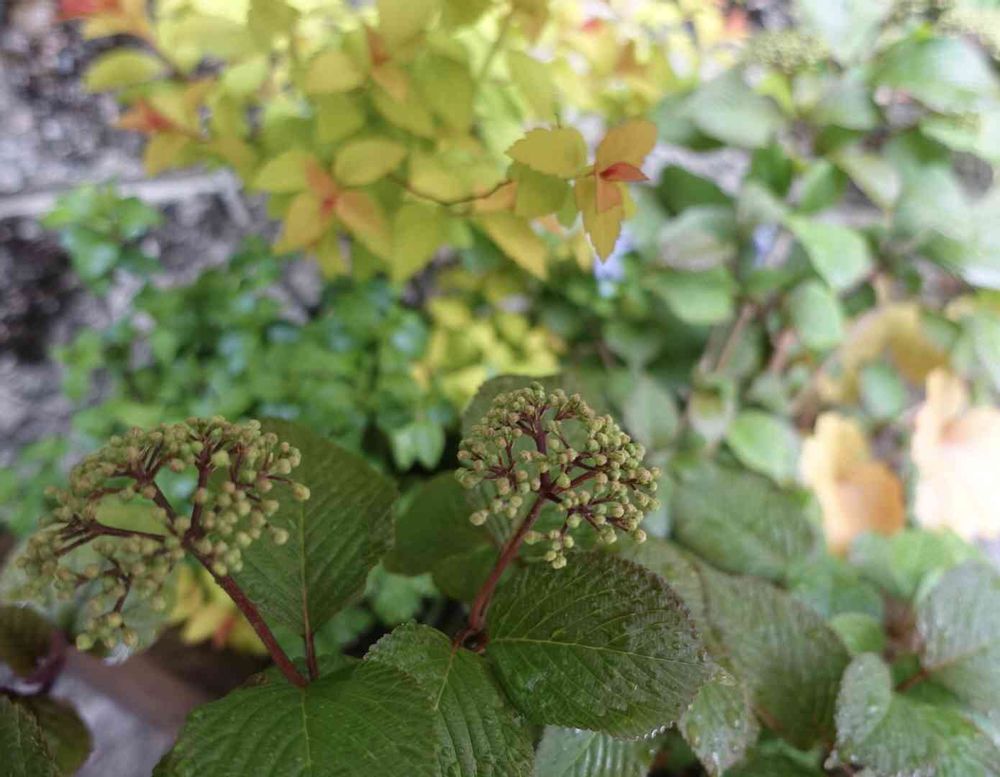 渋いオレンジのオオデマリです。シモツケとヒューケラの葉の色でコーディネートしました。花が咲くのが楽しみです💕