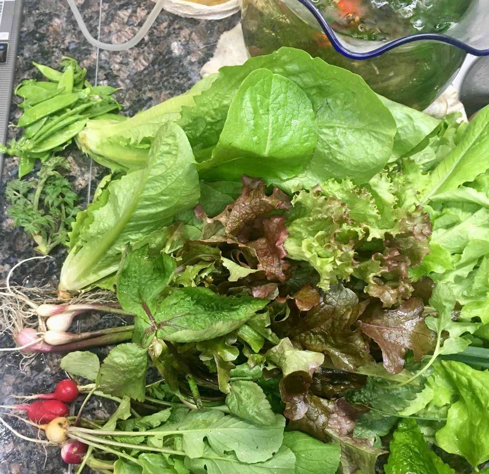 本日の収穫。ロメインレタス、フリルレタス、赤レタス、三つ葉、浅葱、絹サヤ、二十日大根、タラの芽。