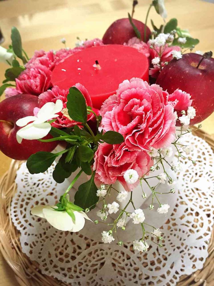 キャンドルを中心にりんごとスプレーカーネーションを生けてみました。庭のビオラをちょっとだけなのでポイントに🌸