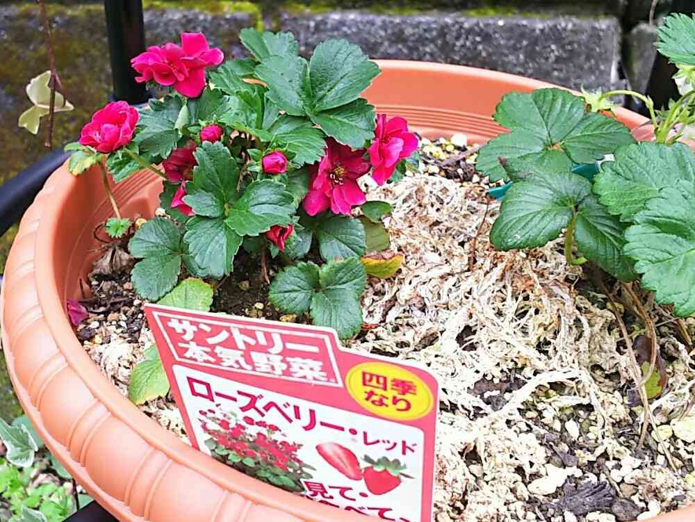 ハイ、いちごの実🍓とローズベリーの赤いお花の共演、待ってます🎵