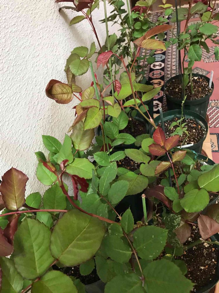 去年3月に挿したバラ9本を先日4→6号鉢に植え替えましたが、お天気によって外に出したり取り込んだり😅