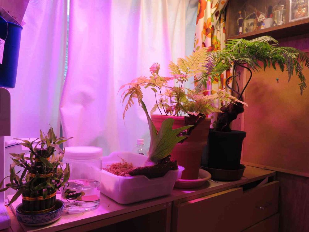 この間、最低気温が13℃まであがったので、安心してカツモウイノデとコウモリランをベランダのある部屋に移していました。その矢先、今日は最低室内気温が10℃以下に下がり、今、カツモウイノデの新芽が心配でしかたないです。しばらく低気温が続きそうなので、現在、室温17℃の自室に取り込みました。そのついでに、うちの植物たち一同に集めて写真を撮りました。うちに居る植物はこれで全部です。どれも味があって頼もしいです。