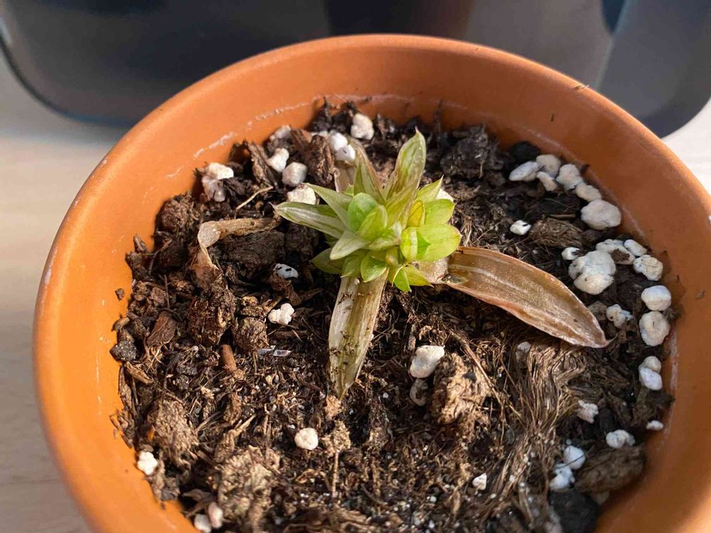 日差しが強くなってきたので屋内に避難🙄斑入りで綺麗な子…やけど何個の子株で構成されてるのか…😆元の子は茶色になった長い葉っぱ…この状態からこれだけの子株出した生命力に感動🤣