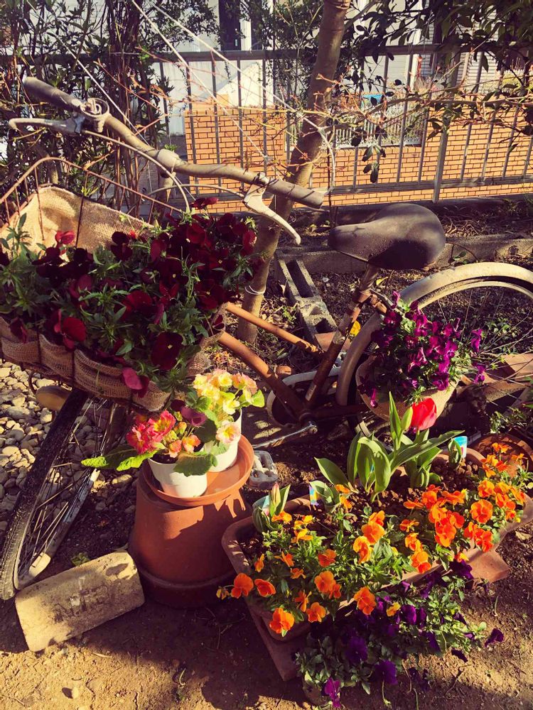 我が家の錆びた自転車にお花を飾ったら、後は、グリーンも入れようと…