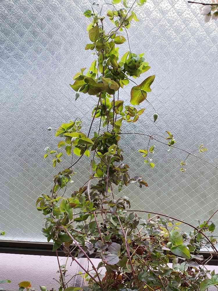 去年、日比谷花壇の花終わりの見切り品株でゲット。一応植え替えたのだけど、つるの仕立て直しをしようとしたら、普通のクレマチス以上に細くて繊細な茎でポキポキ折れだしたので断念。放置していると秋冬に何故かつるが勢いよく伸びて、支柱を超えて伸びまくり、自分で絡みまくり、、、気が付いたら蕾をたくさんつけていました😅💦