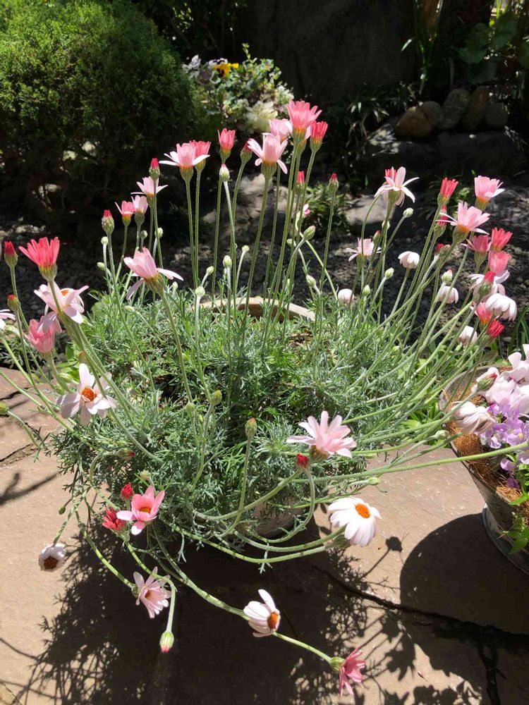 低気圧のおかげでローダンセマムの親株、軒下に避難させてあったのに強風に煽られグルグル🌀🌀🌀目が回ってしまいました。