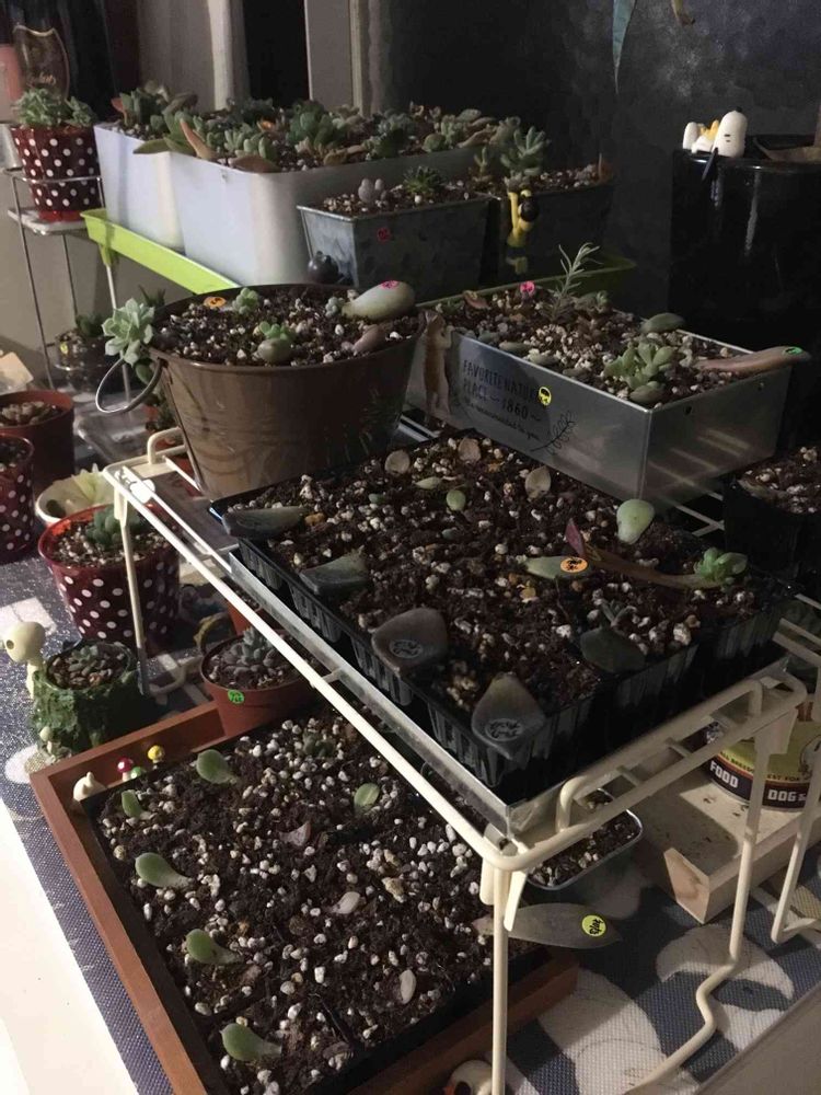 一番上の葉挿しッ子の箱、🐈がのぞいてますね😊可愛い❤️