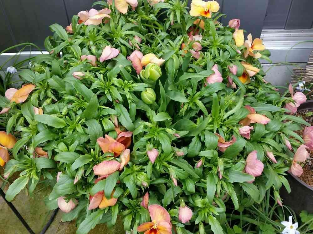 パンジーアプリコットメルバ。11号鉢もパンパンに。もはや手におえません、、、。キツキツにしてごめんね。