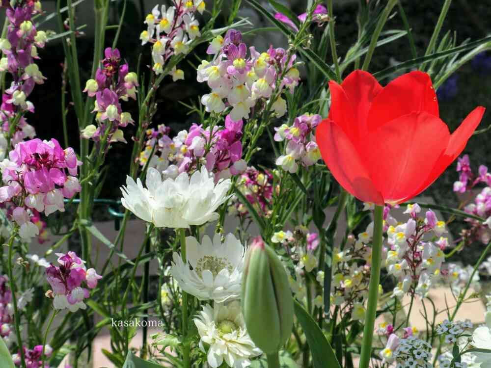 Kasakomaさんの小さな庭,チューリップ,リナリアの投稿画像