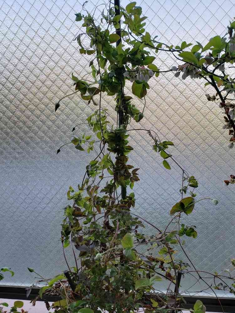 結局、かなり不格好ですが、野菜栽培用のイボ支柱の長いのが家にあるのを発見したので、それを立て、つるをワイヤーでくくりつけてみました😅