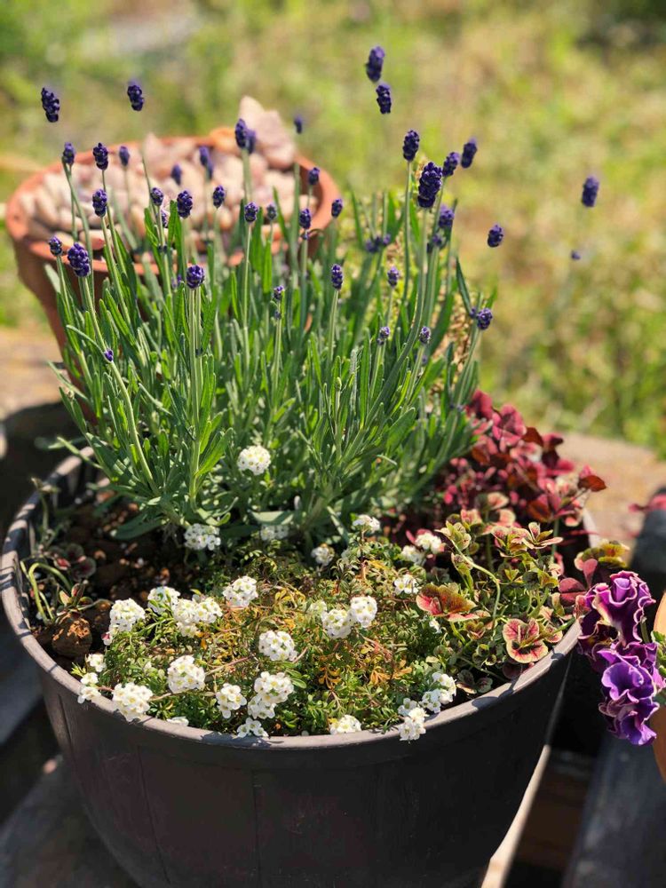 ラベンダーといただき物のクローバー(7葉)を寄せ植えにしました。