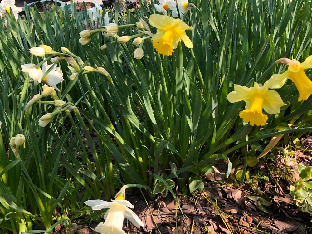 水仙6種と手前にはよくあるムスカリ💜アルメニアカムがすごい事に〜球根の上に球根が重なっていてダンゴ状態です😨😵🤭