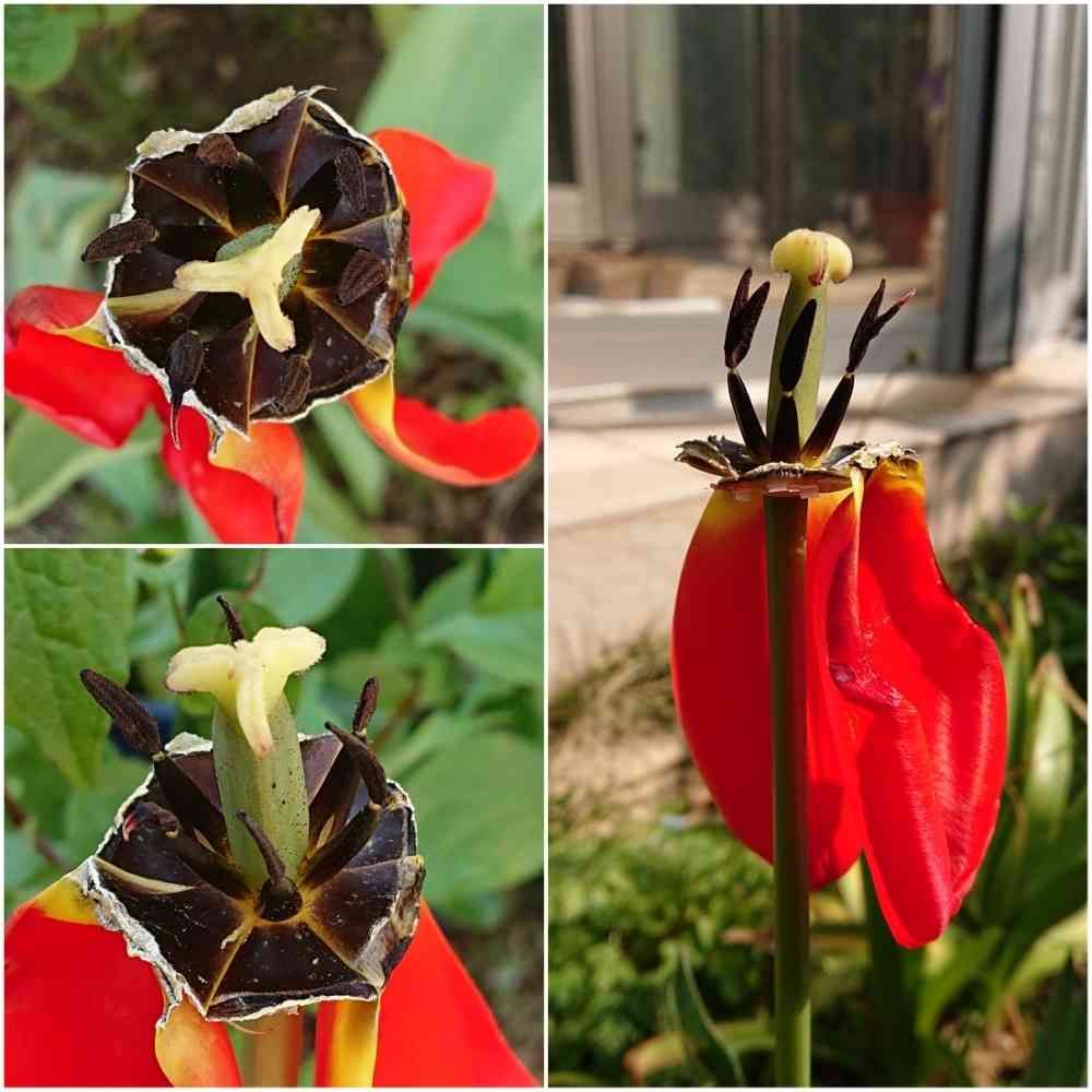 真っ赤なチューリップが散りました😢。随分長く咲いていてくれました、ありがとう。蕊だけを遺してね❣️。