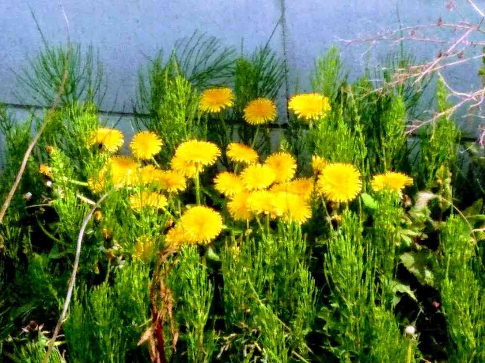 散策の通り道で、小川の向こう岸に、タンポポの花が、固まって咲いていました。