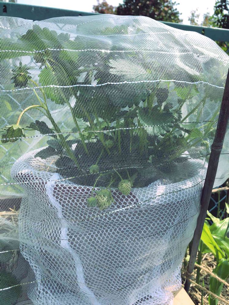 4/16(木)晴れ☀️ 小さい庭の朝の見廻りしています。 イチゴ🍓🍓の鉢にナメクジを見つけてシートをしましたが風通しを考えて洗濯ネットを鉢を丸ごと覆って株元までファスナーをしめました。上から鳥除け下から蟻🐜ナメクジよけに😳😱🤦🏼♀️凄い事になってます(笑) 朝の受粉で幾つものイチゴ🍓🍓🍓食べるんだ〜💕