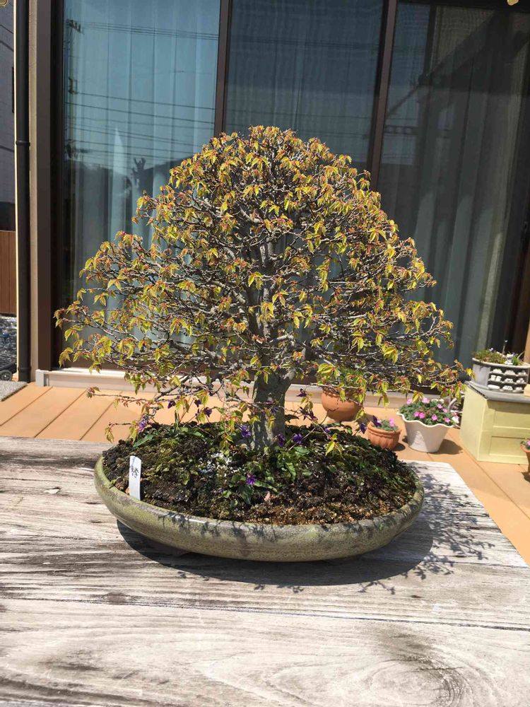 きれいなケヤキの樹形の盆栽の中に