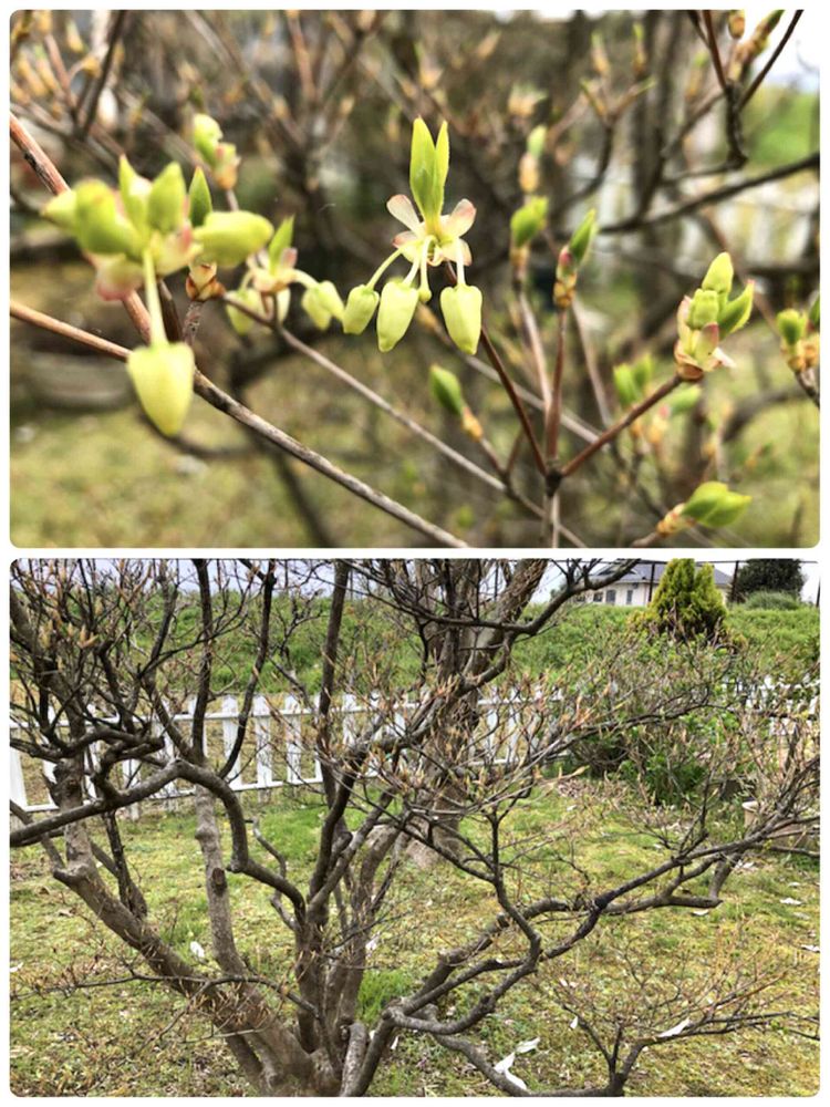 全体的には、花はまだまだ付いてないのに、陽のあたりの良い所なのでしょうか?部分的に小さな鈴の形の花がついています。面白いですね。