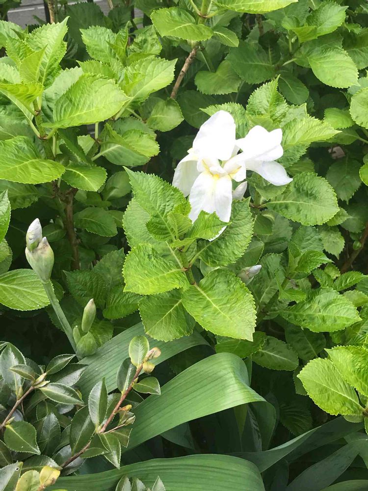 アジサイの葉の間からジャーマンアイリスの白花❣️