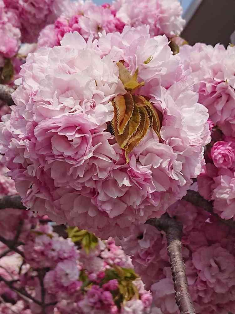 散歩道で咲いてる山桜ですが、どれも鞠のような咲き方してました。