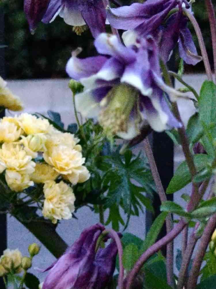 こぼれ種から咲いたオダマキがモッコウバラとコラボできました。
