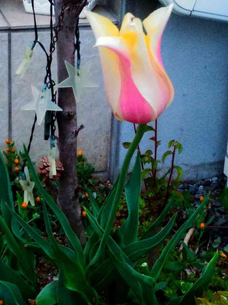 仕事帰りに、通り道のお宅の花壇に植えてある、チューリップ🌷の花が、強い風があり茎が、折れそうでした。