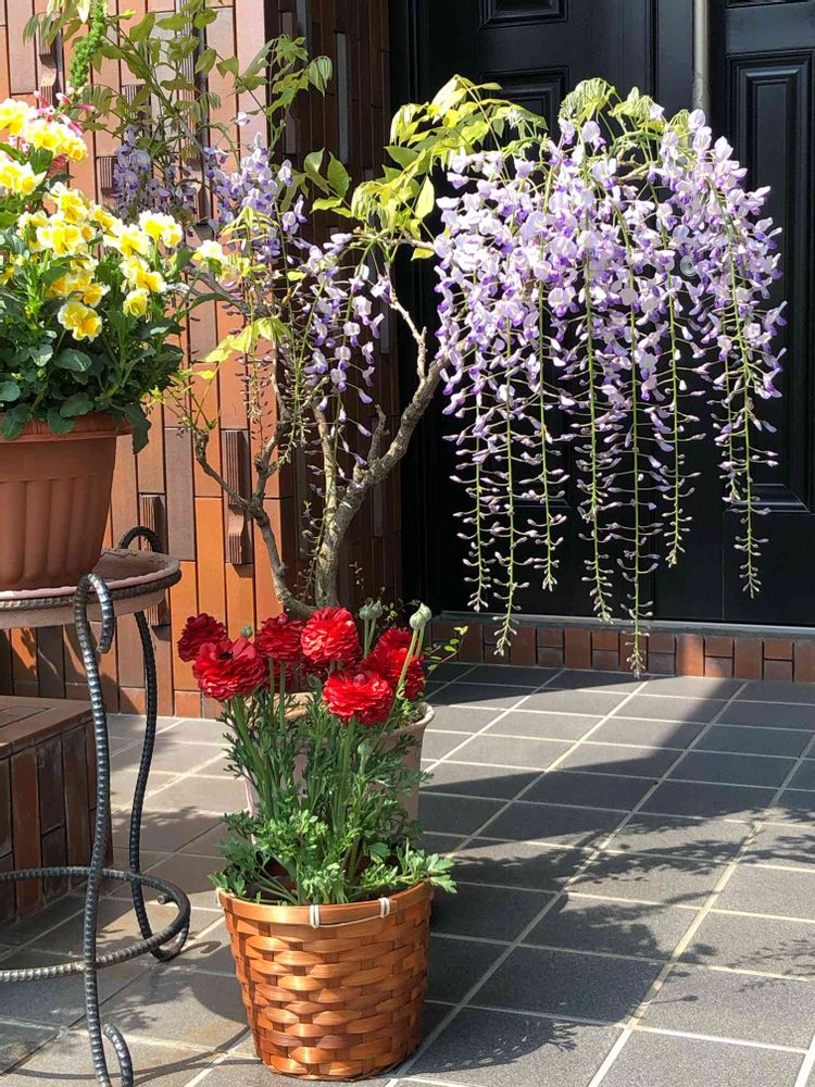 玄関ドア🚪が黒っぽいので、より鮮やかに藤の花が引き立ちますね👏