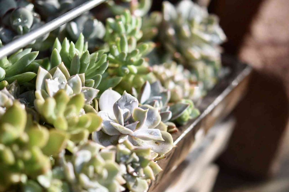 木製マガジンラックに寄せ植えた多肉たちを日光浴☀️