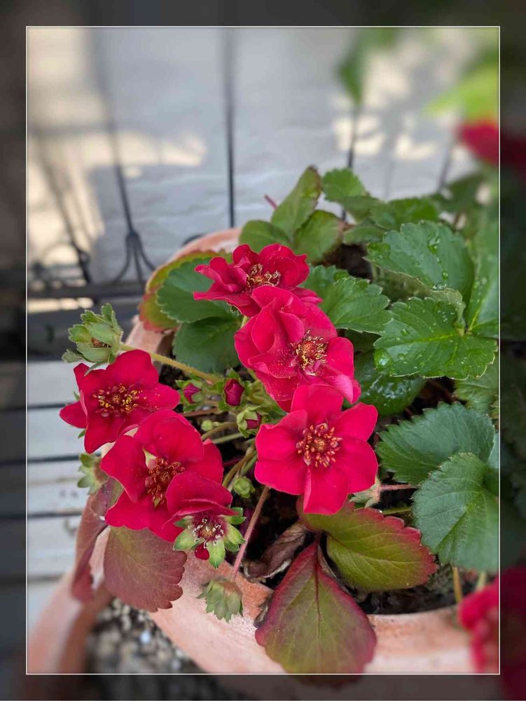 いちごの花は白、と思い込んでいましたよ、きれいですね、いちごとおんなじ赤良いね〜。
