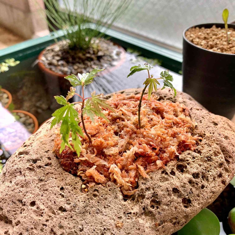 軽石鉢に、水苔で土を包んでモミジを植え付けてみました。