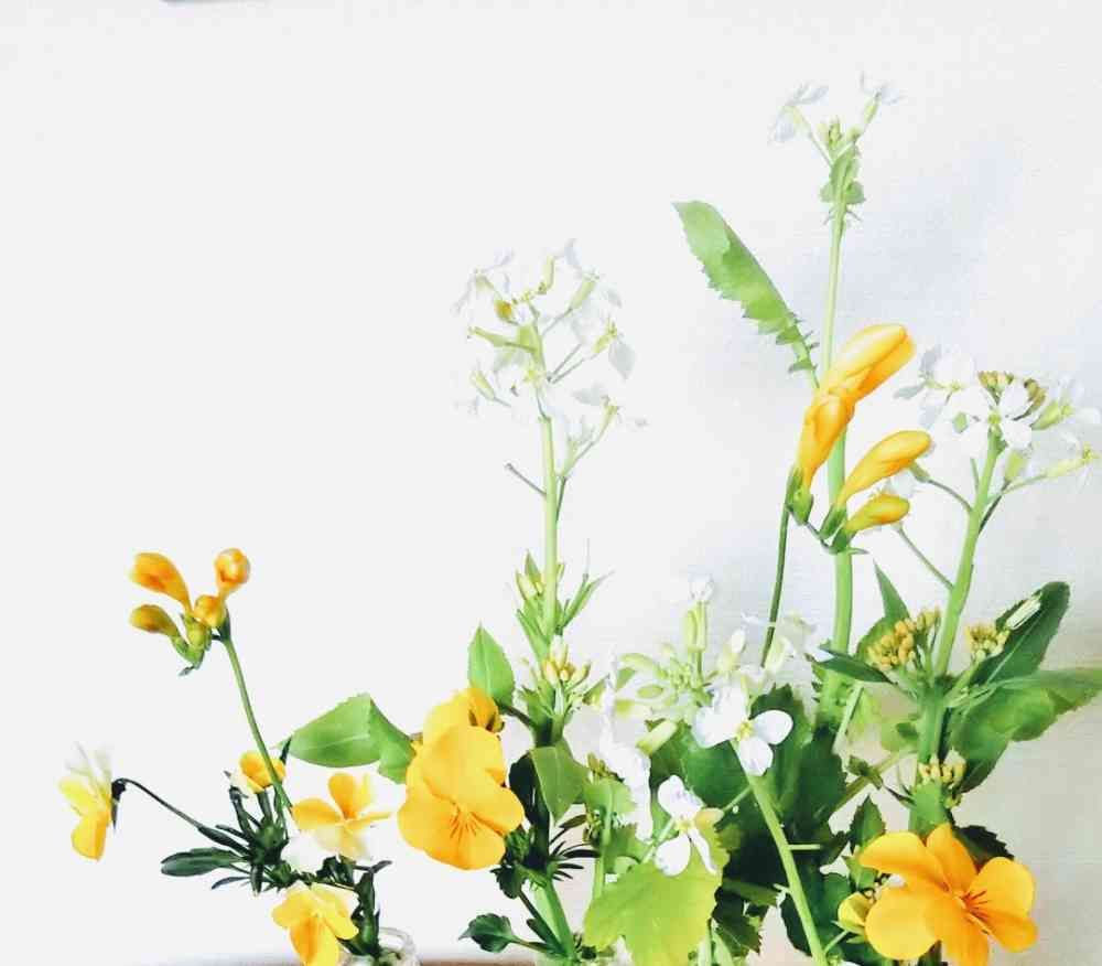 大根の花、フリージア、ビオラを一瓶に1.2本ずつ入れて