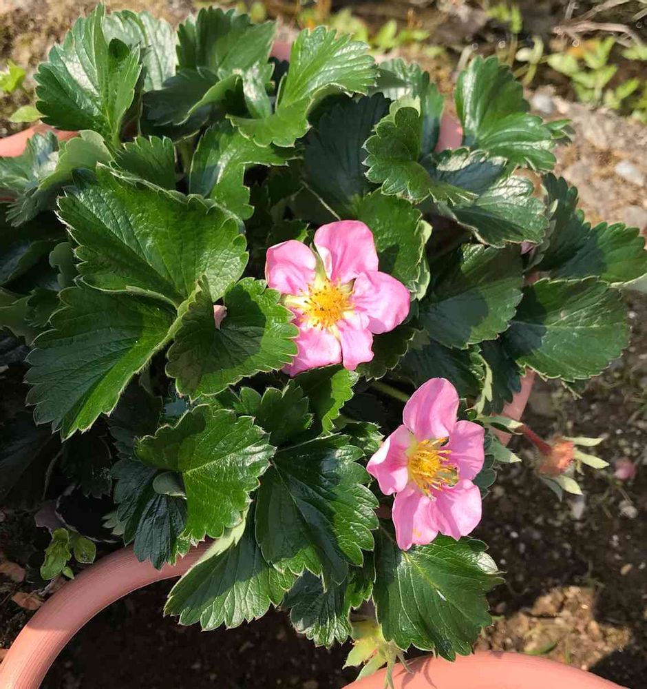 ピンク色のイチゴの花なんて有るのねぇ‼️
