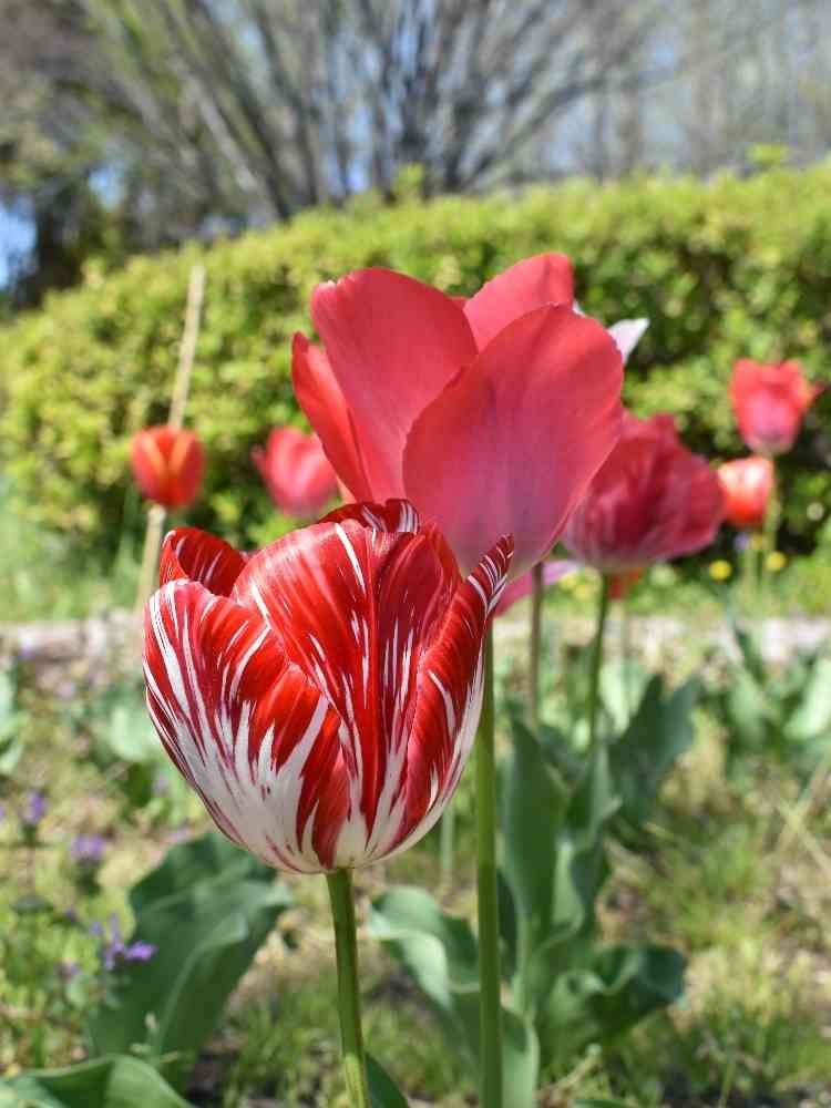 お花探しの散歩中、目を引く斑模様のチューリップ🌷を見つけた。