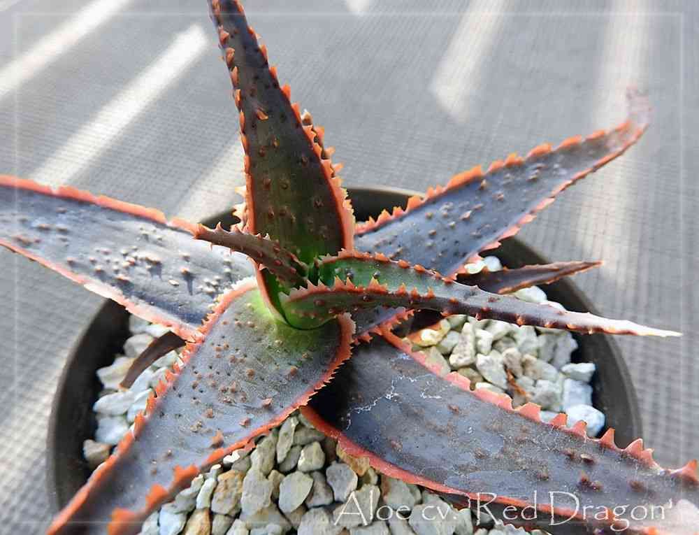 アロエ、レッドドラゴン。去年の11月に素焼き鉢からプラ鉢に植え替えて調子がいい。どうもアロエは思っていたより水が好きらしい。水が足りなくて悶えてる姿も好きだけど、とりあえずもうちょっと大きくなってほしいので水は多めに。色も黒っぽく、縁の鋸歯も赤くてステキ。この調子でいこう。