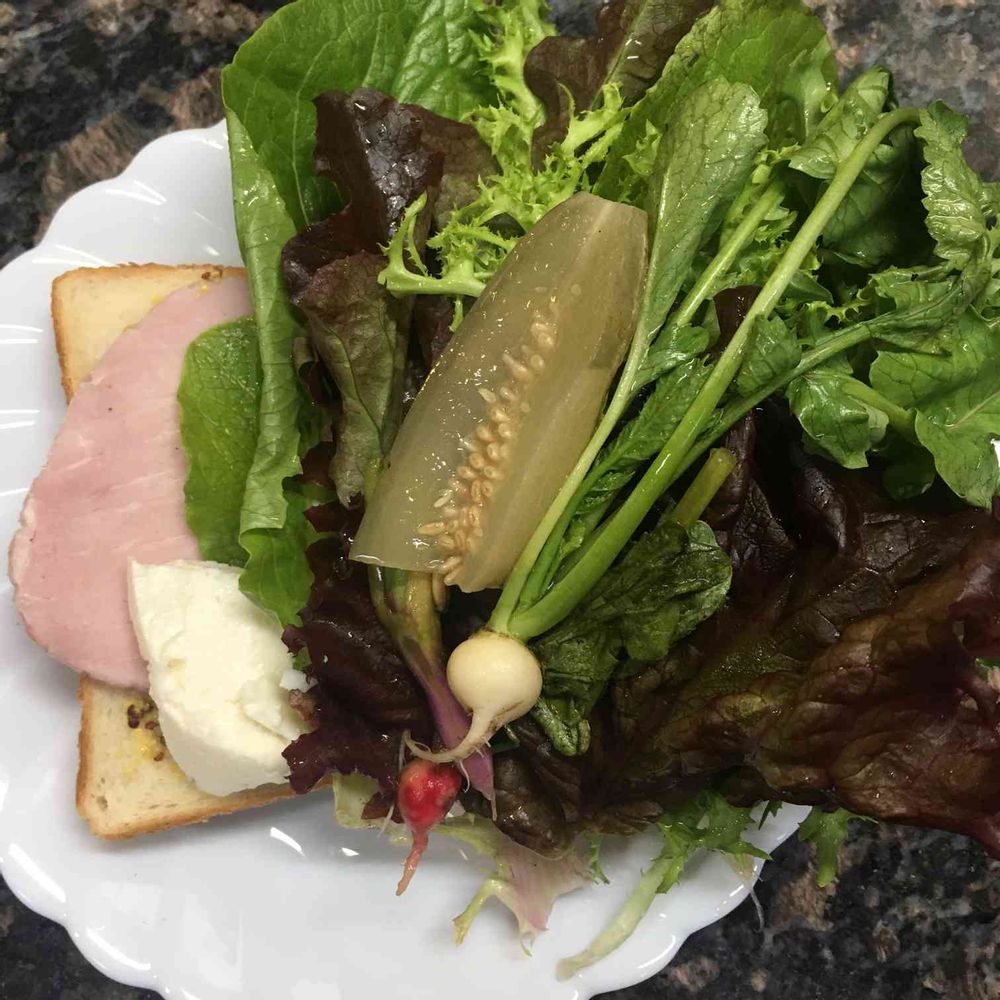 ロメインレタス、赤レタス、エンダイブ、二十日大根浅漬け、太胡瓜ピクルス、自家製カッテージチーズとハムのサンドイッチ。